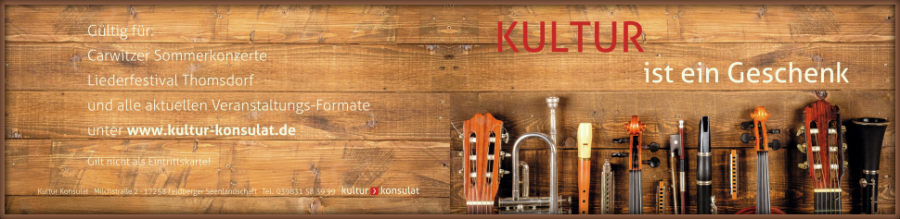 Schenken Sie Ihren Lieben, Bekannten oder Geschäftspartnern einen Kultur-Gutschein, gültig für alle aktuellen Formate bei uns. Bitte senden Sie uns dazu eine Mail mit Ihren Kontaktdaten und die gewünschte Gutscheinsumme an: